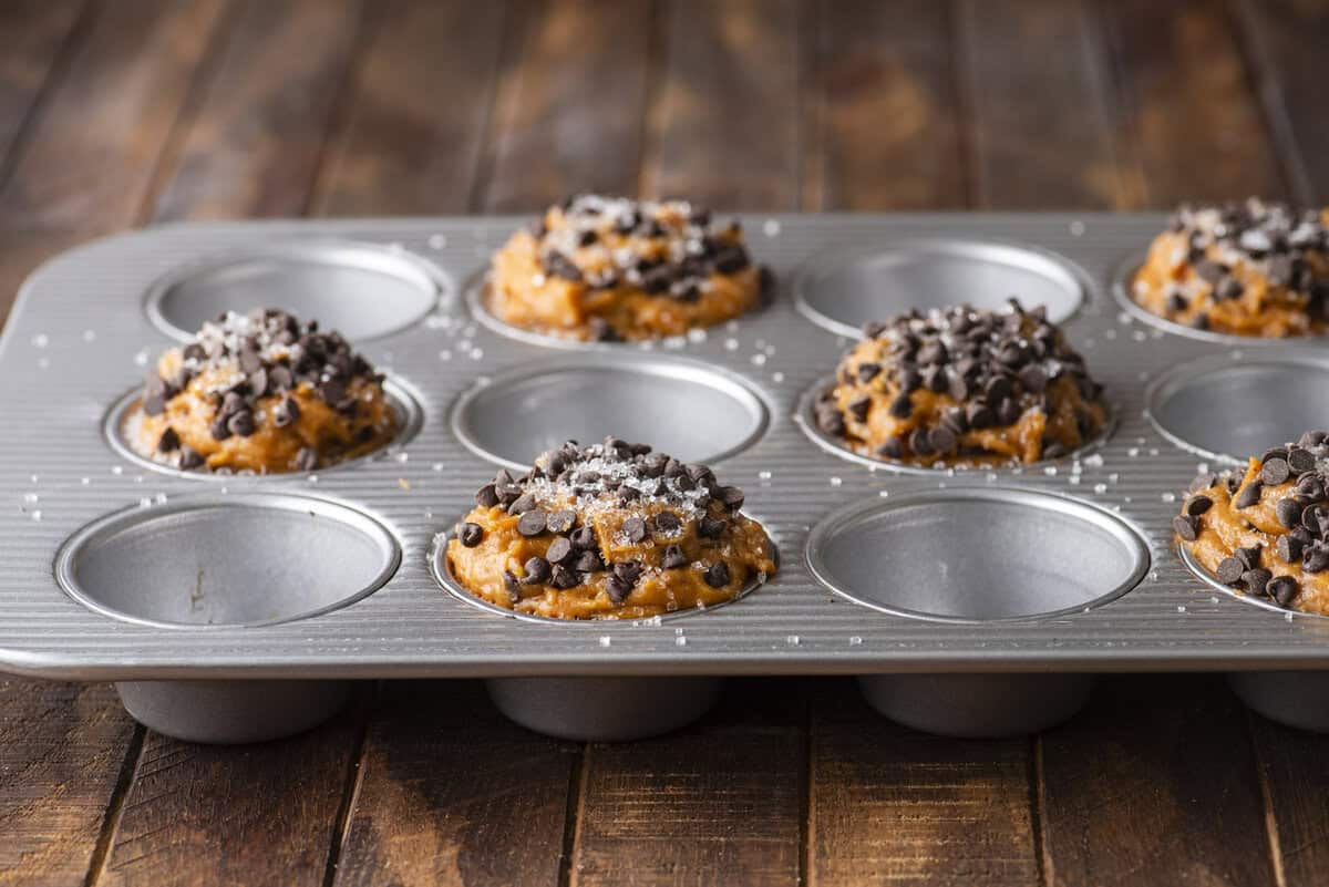 - Prepare pan. For bakery style muffins, line a 12 count muffin pan with 6 muffins liners, meaning you’ll only fill every other muffin well with batter. Fill the liners with 6-8 heaping tablespoons of batter. Top the muffins with the remaining chocolate chips. Sprinkle them with sanding sugar.