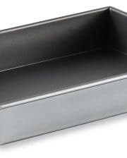 It fits in a 9x 13 pan, but it takes longer to bake through than you specify here. It took about 10 minutes longer in my oven.