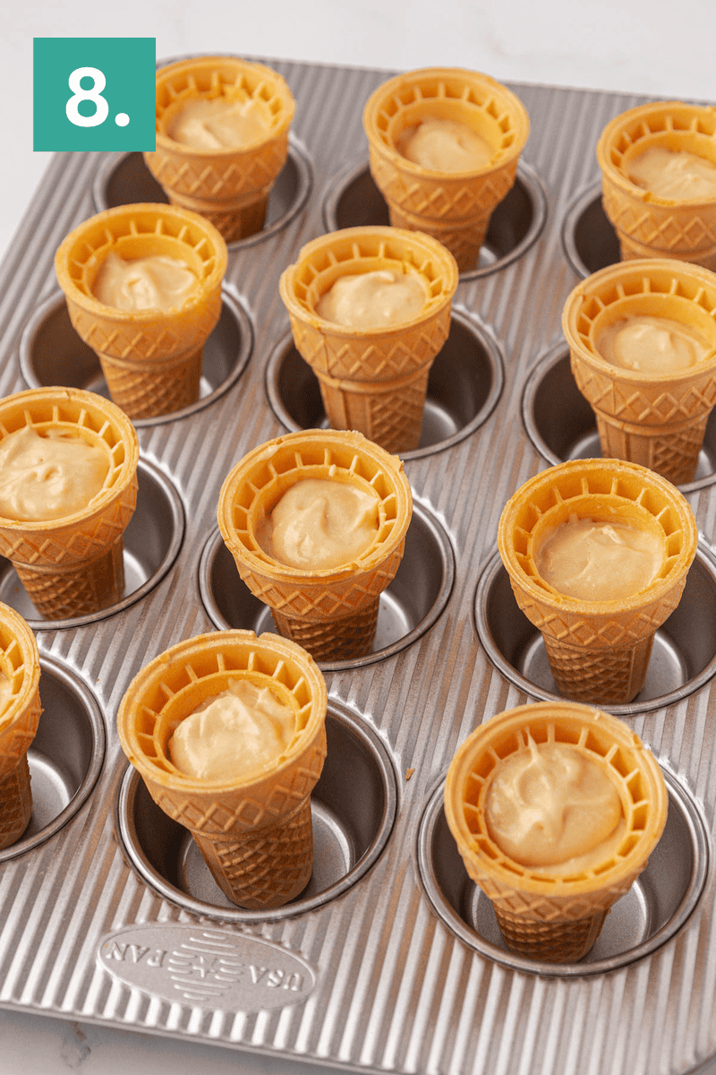 Prep oven and muffin pan: Preheat the oven to 350°F (176°C). Place one ice cream cone upright in each cup of a standard muffin pan. The cones should stand on their own, but if any feel unstable, gently press a small piece of aluminum foil around the base to help keep them in place. Set aside while you prepare the batter.